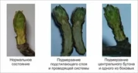 Сильно подмёрзшая или погибшая: Ткани тёмно-коричневые или чёрные, сухие или водянистые, структура размягчена. Такая почка не оживёт.