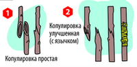 Простая копулировка: На подвое и привое делаем одинаковые длинные косые срезы (2-3 см). Плотно прикладываем срезы друг к другу, чтобы совместились камбиальные слои (тонкая зеленая прослойка под корой), и туго обматываем лентой. Место соединения замазываем садовым варом.