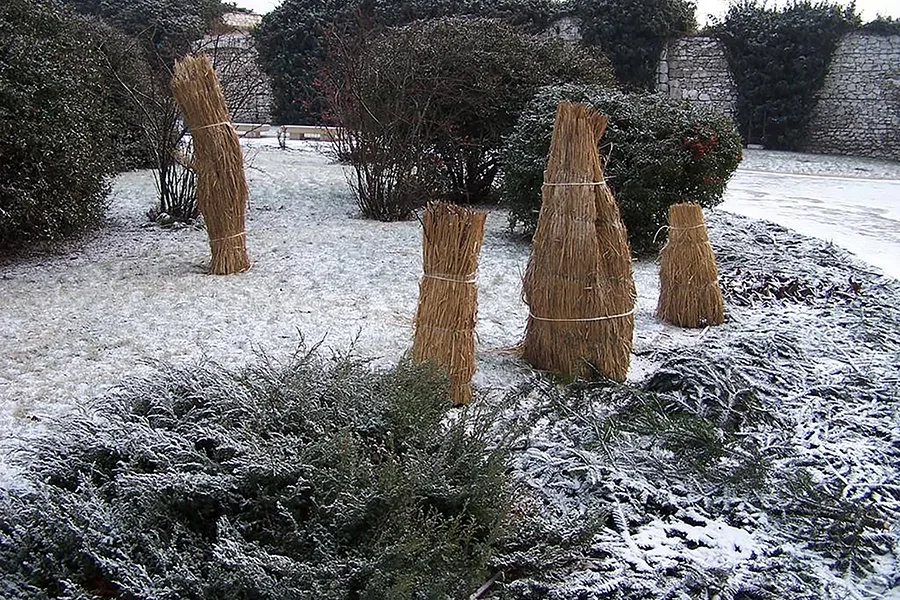 Главный принцип: создать воздушную прослойку между растением и морозным воздухом. Подробнее о разных материалах мы писали в статье Материалы и способы утепления растений: как сохранить сад в холода.